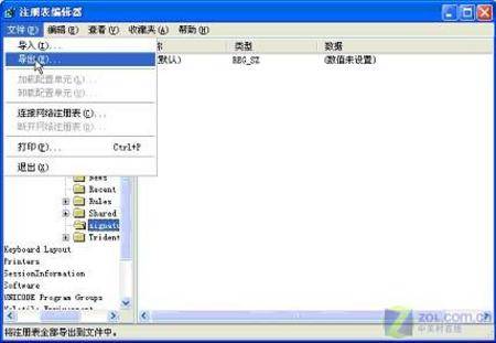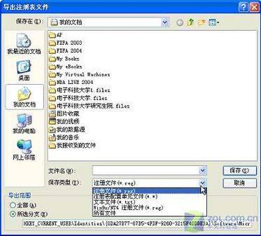 3.签名 通常设置签名有两种形式:一是指定一个含有签名的文本文件;二是直接在OutLook Express里面输入。对于第一种,只需要很简单地把该文本文件复制到另外的地方即可实现备份;对于第二种,则应在注册表里面进行备份操作。 打开运行菜单,输入“regedit”后回车,进入注册表编辑器,依次展开HKEY_CURRENT_USER\Identities\Software\Microsoft\OutlookExpress\5.0\signatures。 (注意“”部分因用户名不同而有差异),然后依次单击“文件à导出”选项,将这个主键导出保存成REG文件(如图5)。