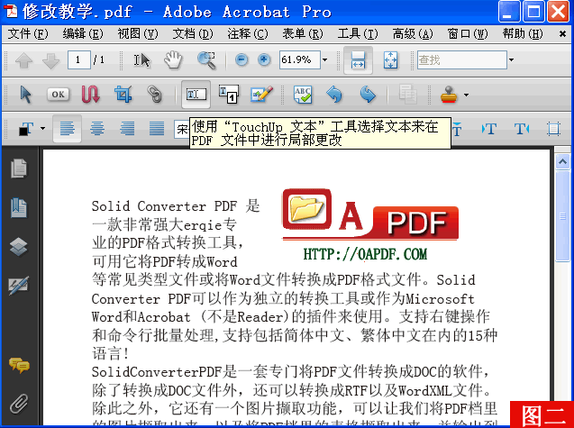 这个例子我们要修改PDF文本里的错别字“erqie”,把他改为“而且”,再把字体调整大一号,改为红色。我们就要用工具栏的“TouchUp文本工具”,若此工具没有在工具栏中,可以在工具栏上按右键,弹出菜单中勾选“高级编辑”,也可以直接从菜单中选取此命令,“工具”→“高级编辑”→“TouchUp文本工具”。如图2: