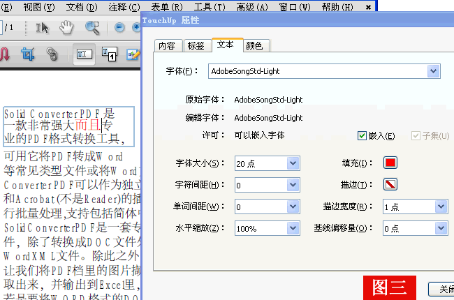 选中我们要修改的那段文字“erqie”,将其改为我们想要的文字“而且”,再在选中的字上按右键,选择“属性”→“文本”,将文字颜色和大小按要求调整,如图3,然后保存,OK。注:利用此工具还可以对文字进行删除,填加等操作。