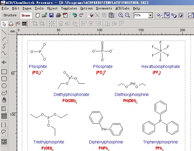 3、ChemSketch ChemSketch是加拿大高级化学发展有限公司(ACD)设计的用于化学作图的软件包, 是通用化学制图与画结构软件,软件有免费版本,该软件包可单独使用或与其他ACD软件共同使用。其功能可通过结构、绘图、和分子性质三种摸式来实现,利用内置的摸板及简单的工具即可快捷的画出分子、离子、箭头、化学结构等和计算它们的属性,也可用于文本和图象处理,并可对物质的性质进行估算。能检查并生成有机结构的最常见的异构体。软件里提供了数千种常见结构式的命名,而且使用标准的IUPAC命名法。利用ChemSketch丰富的模板,强大的绘图功能和导入、导出功能,可以制作出各式各样的图形、图像素材,使其具有一定的创作兼教育性,可应用于化学教育、辅助化学教学、辅助化学CAI课件制作及素材创作。 ChemSketch 8.0商业版本可以输出标准的 PDF 格式及 WMF、BMP 图形格式,其输出的PDF文件置入 InDesign 没有问题,但免费版本没有输出PDF的功能。 ChemSketch 开发者网站:http://www.acdlabs.com,最新版本是8.0,为Windows版本,免费版本约19MB。