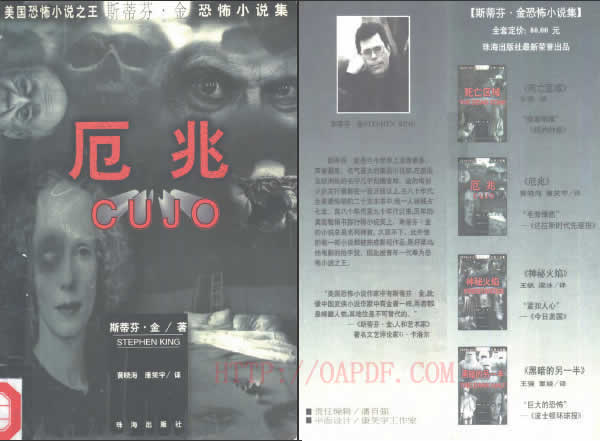 图书在版编目(CIP)数据 COJO First pablished in the United States under the tirle COJO by Stephen King. Copyright © Stephen King,1981. Published by arrangement with Dutton Signet,a division of Penguin Books USA Inc. 本书经中华版权代理总公司代理,由美国企鹅图书公司•达 顿悉格耐(Dutton Signet)分公司授予珠海出版社独家中文 简体出版权 斯蒂芬•金恐怖小说集 ISBN 7-80607-225-X ¥80.00元 Ⅰ. 斯… Ⅱ. ①黄…②康… Ⅲ. 小说-恐怖-美国 Ⅳ. I712.46 斯蒂芬•金恐怖小说集 翻 译:黄晓海 康笑宇 终 审:成 平 责任编辑:潘自强 封面设计:康笑宇 出版发行:珠海出版社 电 话:3331403 邮政编码:519015 照 排:珠海出版社电脑照排中心 印 刷:广东省番禺市印刷厂 开 本:850×1168mm 1/32 印 张:55.75 字数:1350千字 版 次:1997年1月第1版 1997年1月第1次印刷 印 数:1-10000 ISBN7-80607-225-X/I•160 定 价:80.00元(全四册•每册20.00元) ![]() 点击下载该PDF图书 大小:2.84MB |