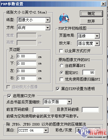 选择好图像文件之后,就该设置生成PDF文档的参数了。点击“参数设置”进入设置对话框(图3),在这儿你可以就纸型、页边距、页面整体布局、DPI分辨率、压缩算法速度等等。